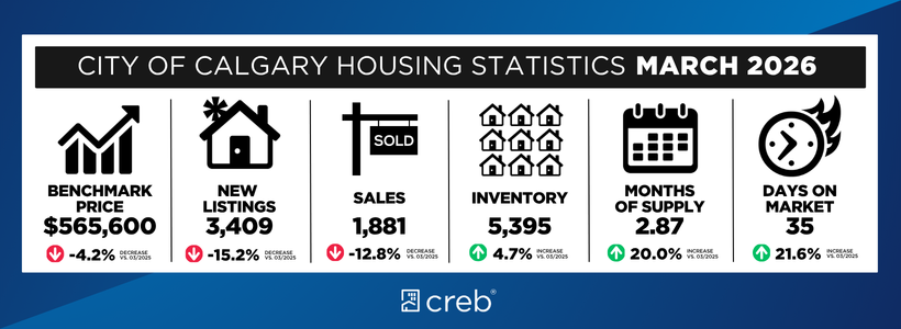 Calgary, Alberta, April 1, 2026 – Supply conditions in March varied significantly depending on property type. Inventory levels saw a typical monthly rise, but compared with long-term trends, inventory remained well above the 10-year average for both row and apartment-style units and well below trend for detached homes. This is not a surprise given the pullback in detached housing starts last year despite record-high apartment-style starts.