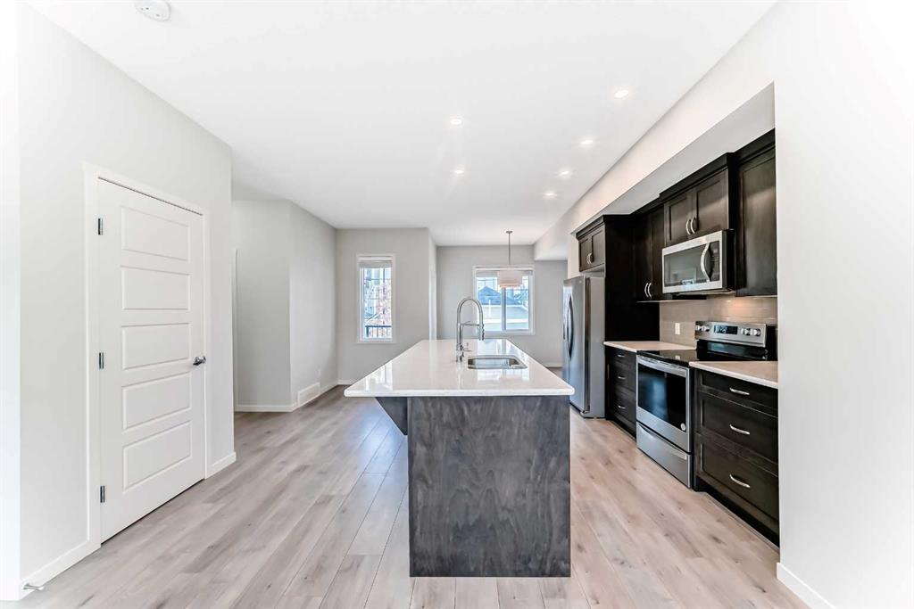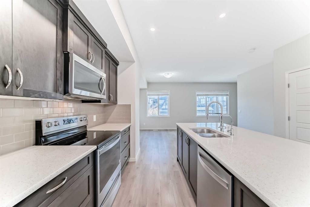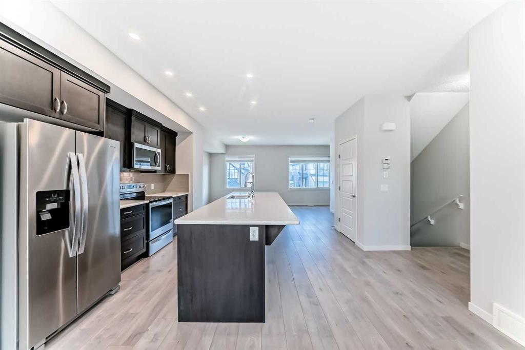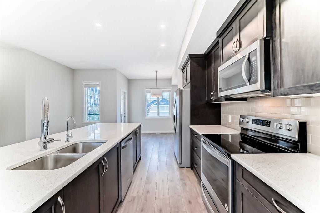 This gorgeous 3 bed, 2.5 bath townhome comes with a double attached garage and shows like new. The main level consists of luxury vinyl plank flooring, 9' ceilings and large windows that bring in tons of natural sunlight. The kitchen is a Chef's delight offering upgraded S/S appliances, custom cabinets, granite counter-tops and a huge center island/breakfast bar that overlooks the large living room. Completing the main floor is a 2pc bath plus a separate dining area that grants access to a North facing balcony with a BBQ gas line hook-up. Upstairs you will find an oversized primary bedroom with a walk-in closet plus a 4pc ensuite with dual vanities. Completing the upper level are two additional bedrooms, another 4pc bath and laundry area. The lower/ground floor level features a spacious den/office area plus a storage/furnace room and access to the double attached garage. Located close to schools, parks, playgrounds, walking paths, City transit, major shopping/restaurant's and easy access to main roadways.